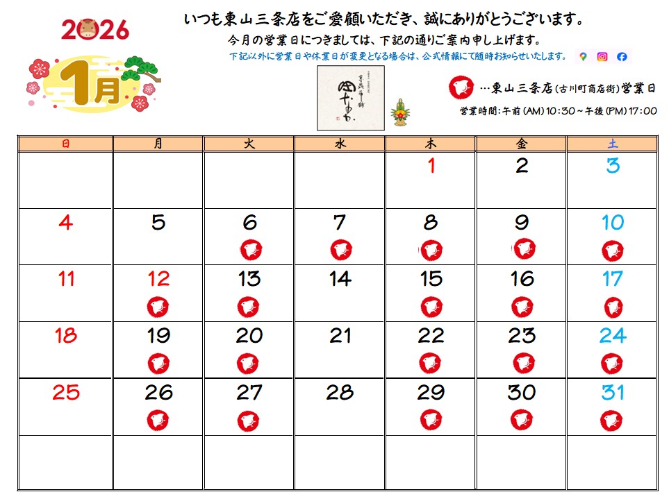 1月 東山三条店 営業日のお知らせ 2025.12.30 1月 東山三条店 営業日のお知らせ 🌿京昆布舗田なかよりお知らせ🌿 臨時の営業日やお休みがある際は、こちらでご案内いたします。 フェイスブック・インスタグラム・グーグルマップでも情報を発信しておりますので、 ぜひご覧ください🐤