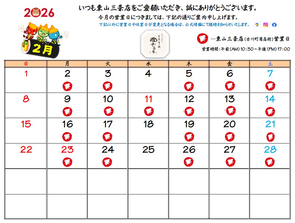 3. 2月 東山三条店 営業日のお知らせ